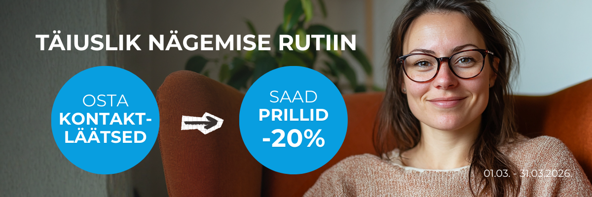 Osta oma lemmik kontaktläätsed ja saa 20% allahindlust prillidelt. Ka kõige pühendunumad kontaktläätsede kandjad vajavad vahel puhkust – ja kvaliteetne prillipaar on selleks ideaalne lahendus.